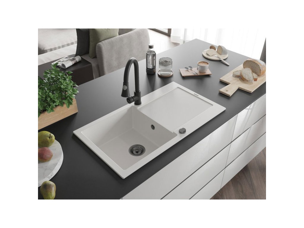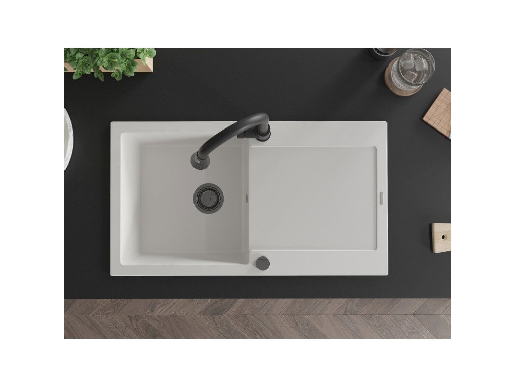 Granitový drez Mexen Leo s 1 misou, odkapávačom a kuchynskou batériou Elia, biely - 6501-20-670101-70