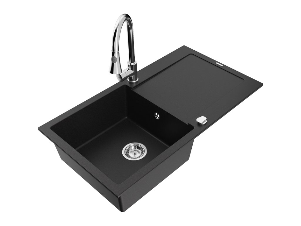 Granitový drez Mexen Leo s 1 misou, odkapávačom a kuchynskou batériou Elia, čierny - 6501-77-670101-00