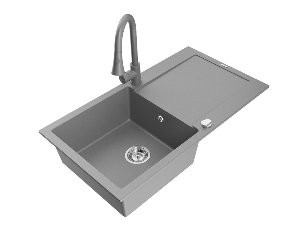 Granitový drez Mexen Leo s 1 misou, odkapávačom a kuchynskou batériou Elia, sivý - 6501-71-670101-71