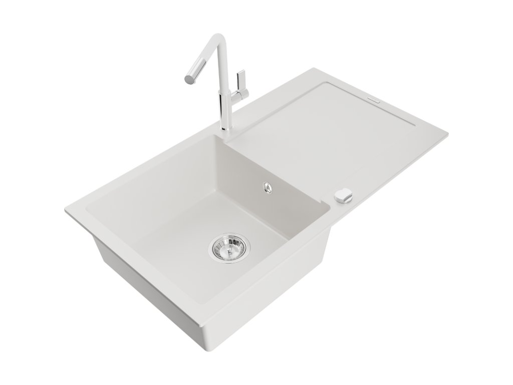 Granitový drez Mexen Leo s 1 misou, odkapávačom a kuchynskou batériou Flora, biely - 6501-20-670401-02