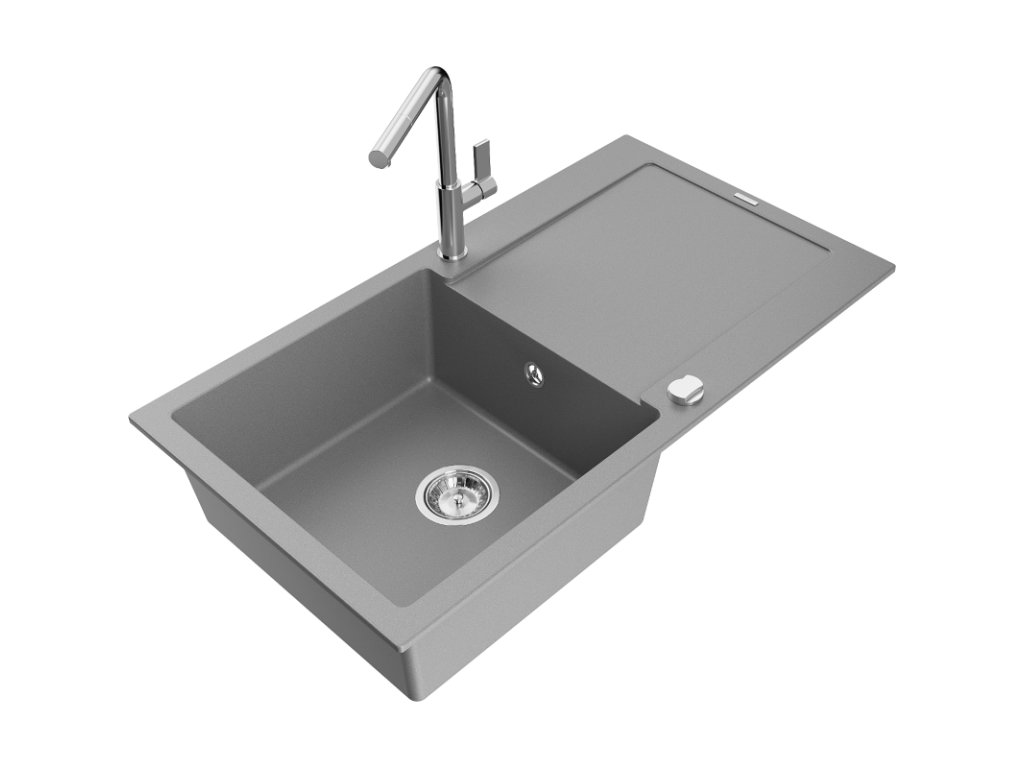 Granitový drez Mexen Leo s 1 misou, odkapávačom a kuchynskou batériou Flora, sivý - 6501-71-670401-00