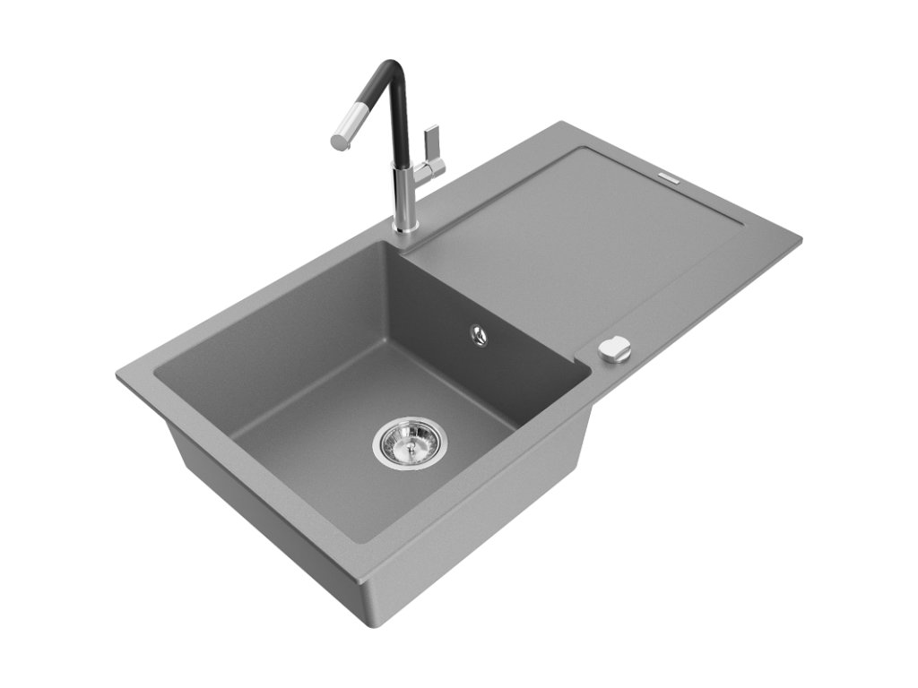 Granitový drez Mexen Leo s 1 misou, odkapávačom a kuchynskou batériou Flora, sivý - 6501-71-670401-07