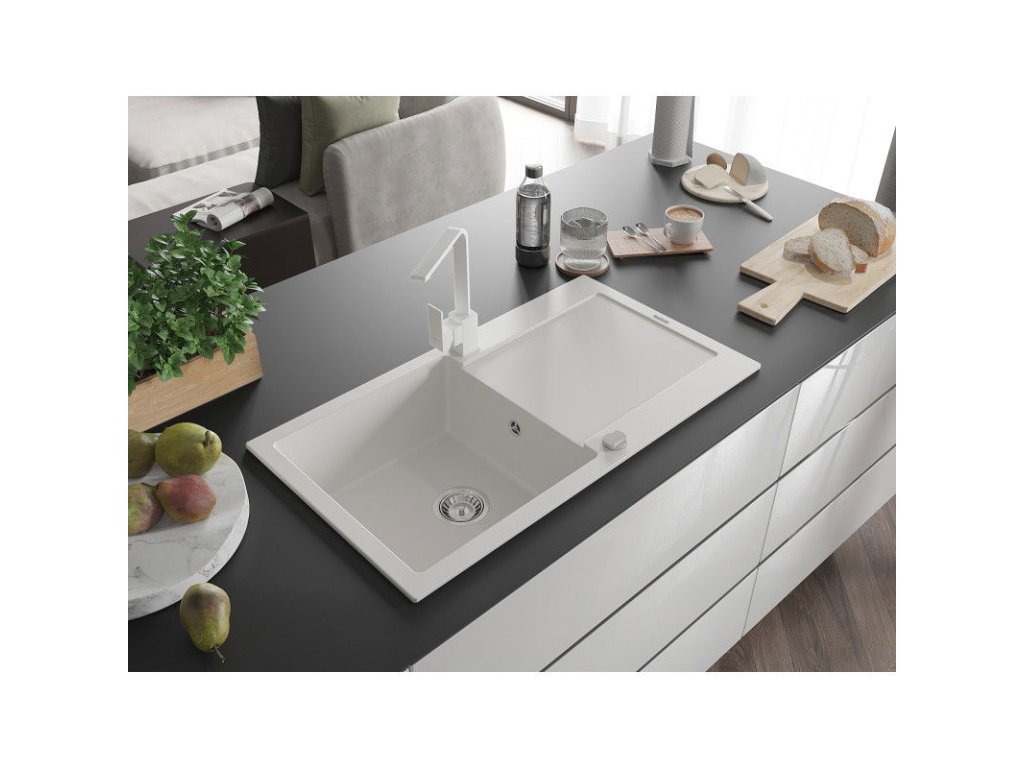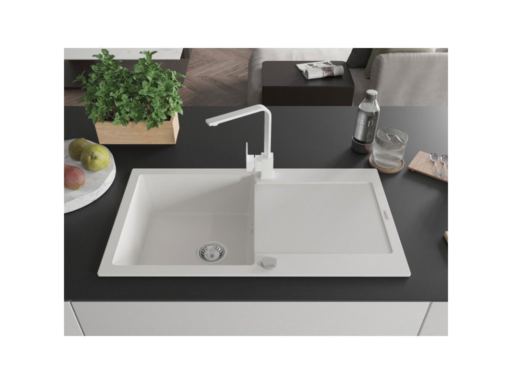 Granitový drez Mexen Leo s 1 misou, odkapávačom a kuchynskou batériou Rita, biely - 6501-20-670300-20