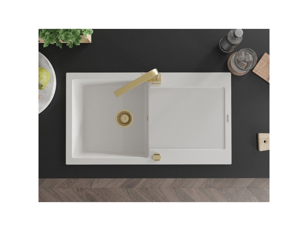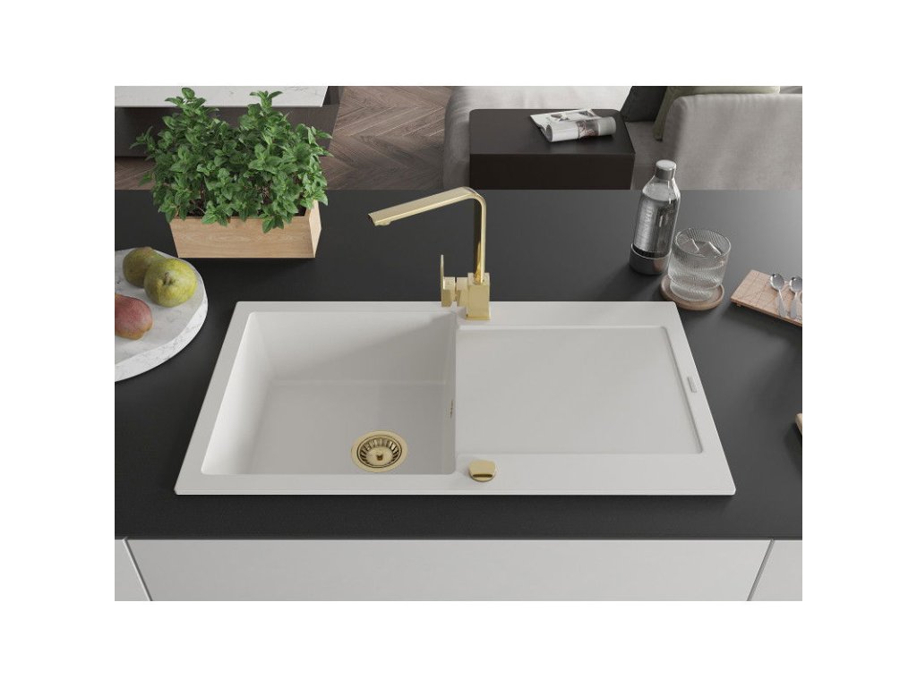 Granitový drez Mexen Leo s 1 misou, odkapávačom a kuchynskou batériou Rita, biely - 6501-20-670300-50