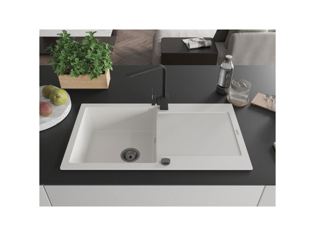 Granitový drez Mexen Leo s 1 misou, odkapávačom a kuchynskou batériou Rita, biely - 6501-20-670300-70