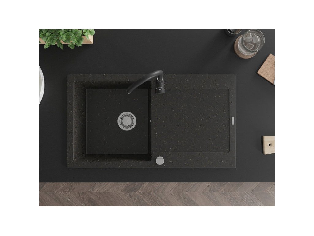 Granitový drez Mexen Leo s 1 misou, odkapávačom a kuchynskou batériou Telma, čierna/zlatá metalíza - 6501-75-670200-70