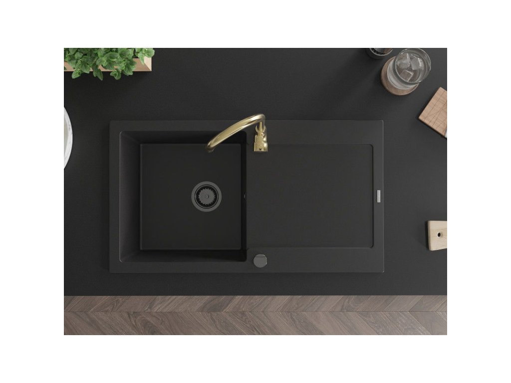 Granitový drez Mexen Leo s 1 misou, odkapávačom a kuchynskou batériou Telma, čierny - 6501-77-670200-50