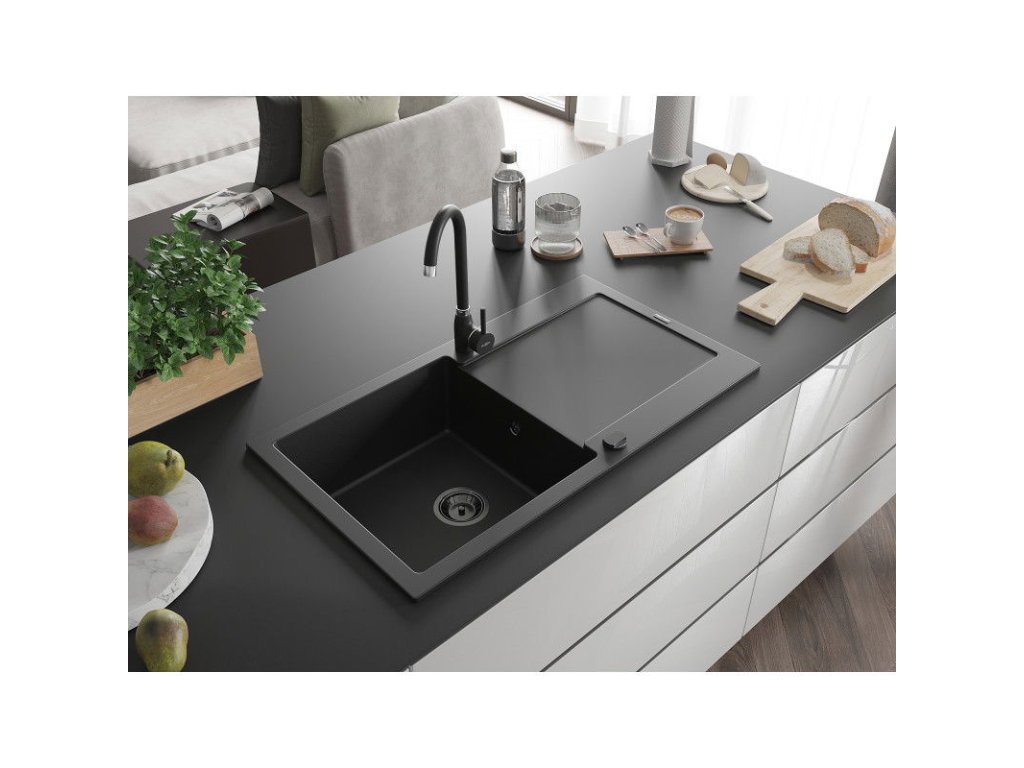 Granitový drez Mexen Leo s 1 misou, odkapávačom a kuchynskou batériou Telma, čierny - 6501-77-670200-70-B