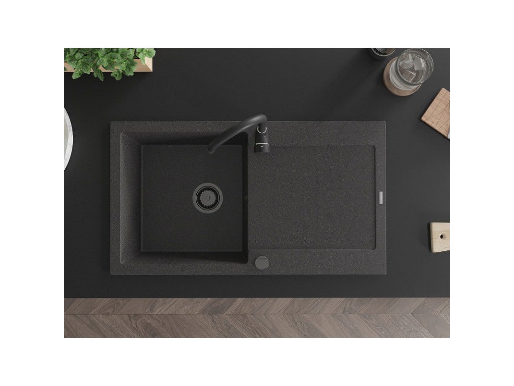 Granitový drez Mexen Leo s 1 misou a odkapávačom 900 x 500 mm, čierny bodkovaný, čierny sifón - 6501901010-76-B