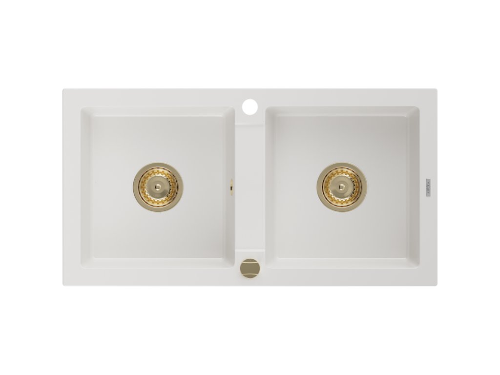 Granitový drez Mexen Mario s 2 misami, 820 x 436 mm, biely, zlatý sifón - 6504822000-20-G