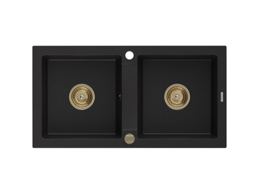Granitový drez Mexen Mario s 2 misami, 820 x 436 mm, čierny, zlatý sifón - 6504822000-77-G