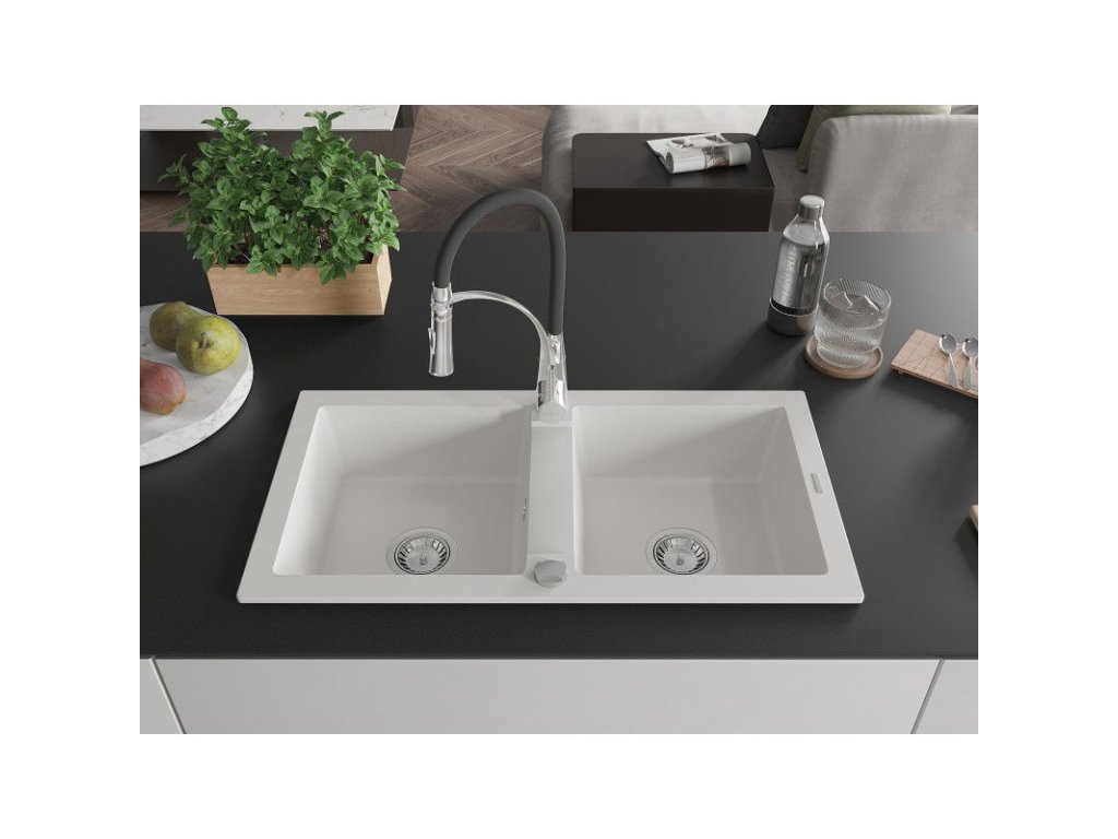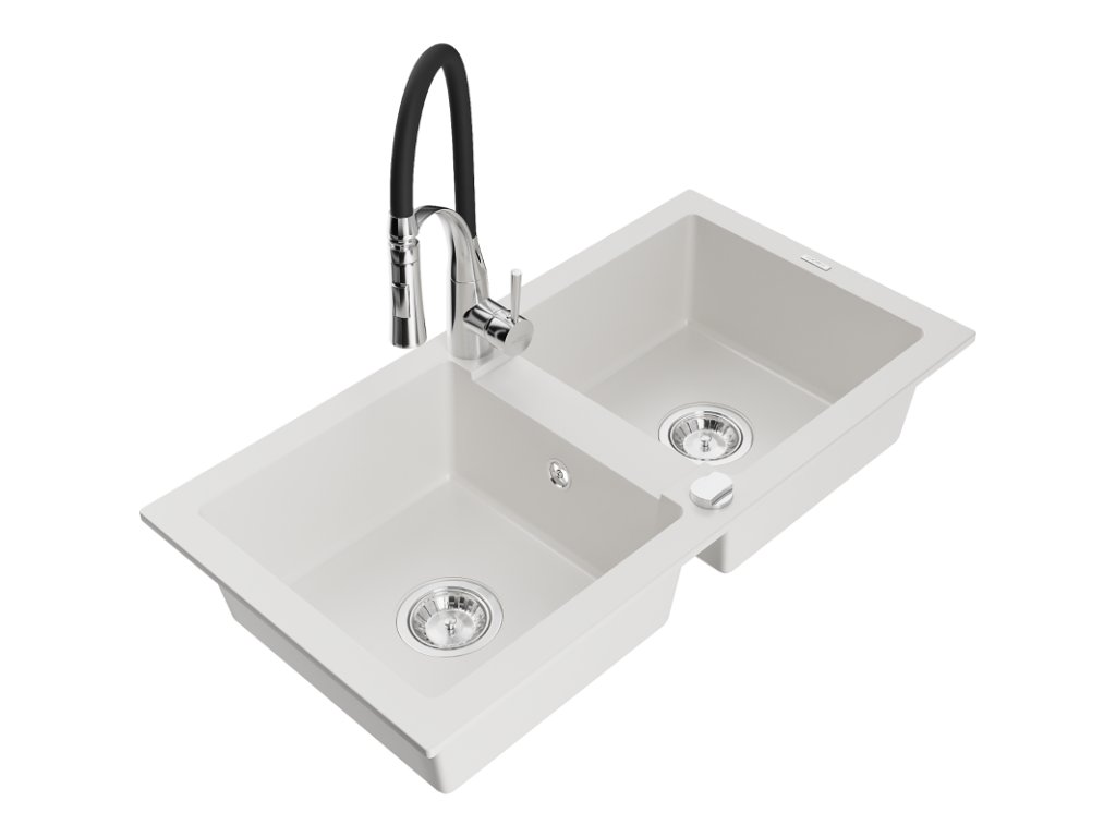 Granitový drez Mexen Mario s 2 misami a kuchynskou batériou Aster, biely - 6504-20-73450-07