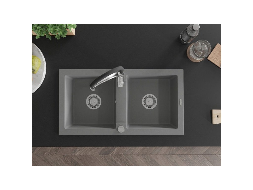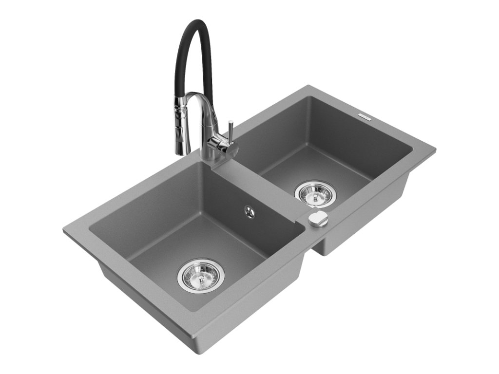Granitový drez Mexen Mario s 2 misami a kuchynskou batériou Aster, sivý - 6504-71-73450-07