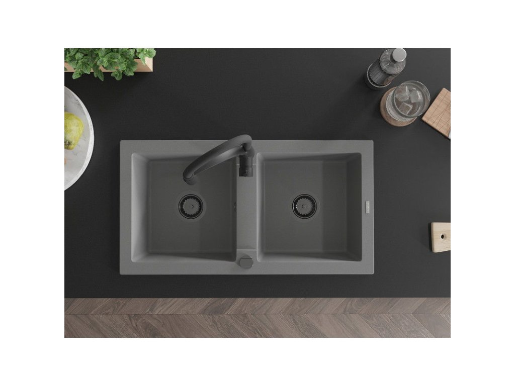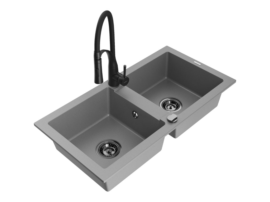 Granitový drez Mexen Mario s 2 misami a kuchynskou batériou Aster, sivý - 6504-71-73450-70-B