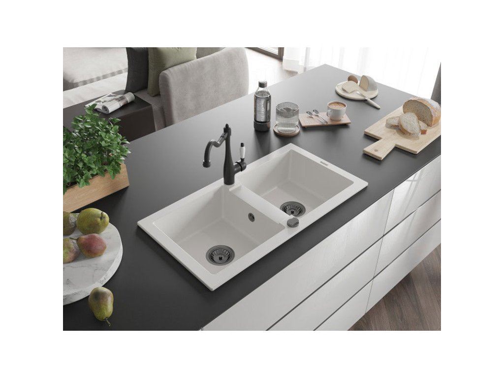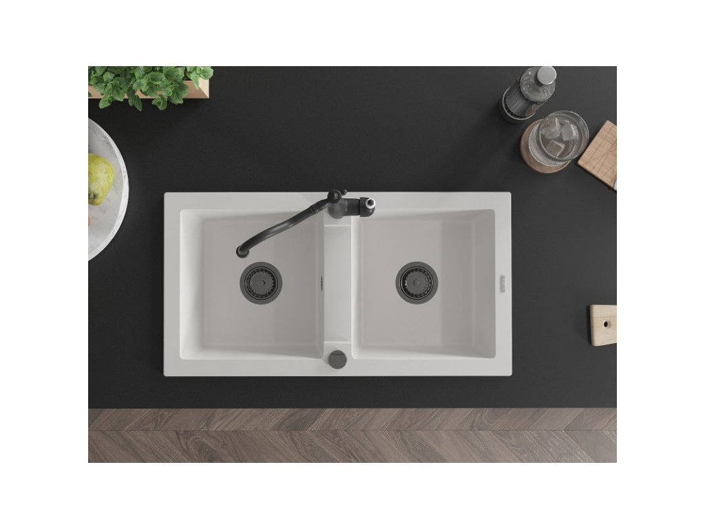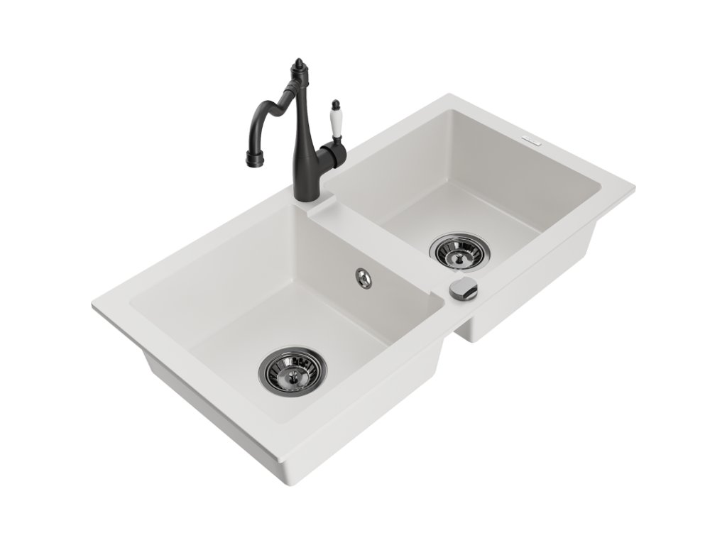 Granitový drez Mexen Mario s 2 misami a kuchynskou batériou Carla, biely - 6504-20-670700-70