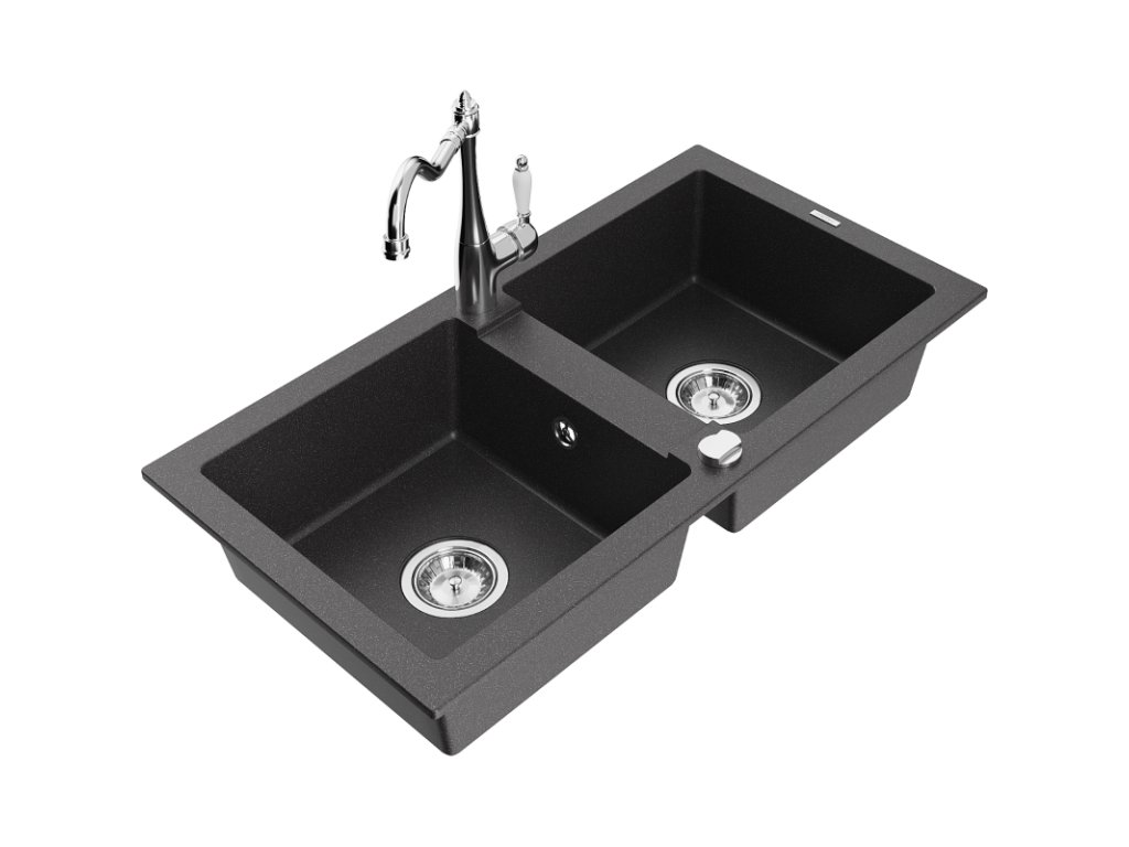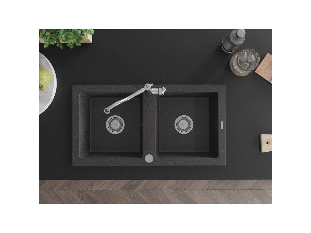 Granitový drez Mexen Mario s 2 misami a kuchynskou batériou Carla, čierna škvrnitá - 6504-76-670700-00