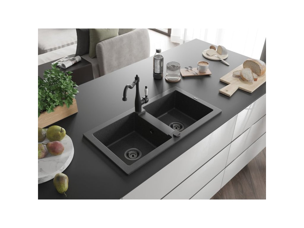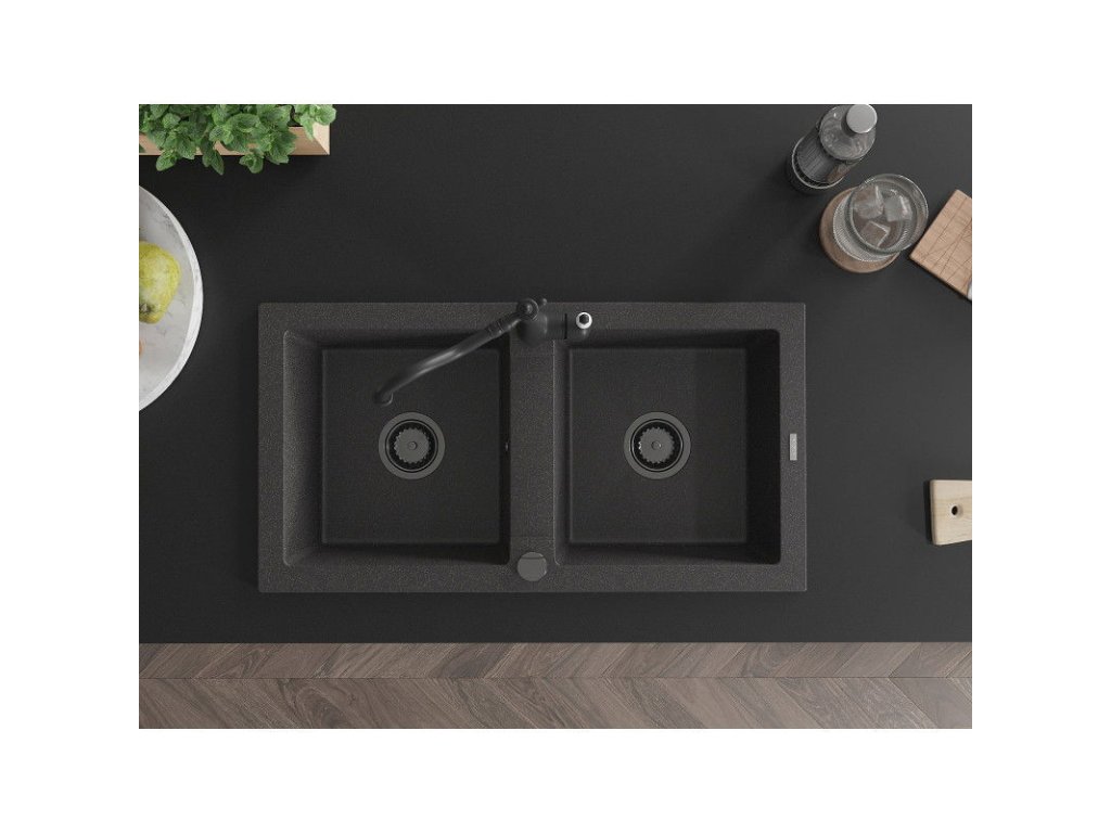 Granitový drez Mexen Mario s 2 misami a kuchynskou batériou Carla, čierna škvrnitá - 6504-76-670700-70-B
