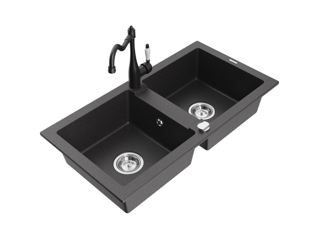 Granitový drez Mexen Mario s 2 misami a kuchynskou batériou Carla, čierna škvrnitá - 6504-76-670700-70