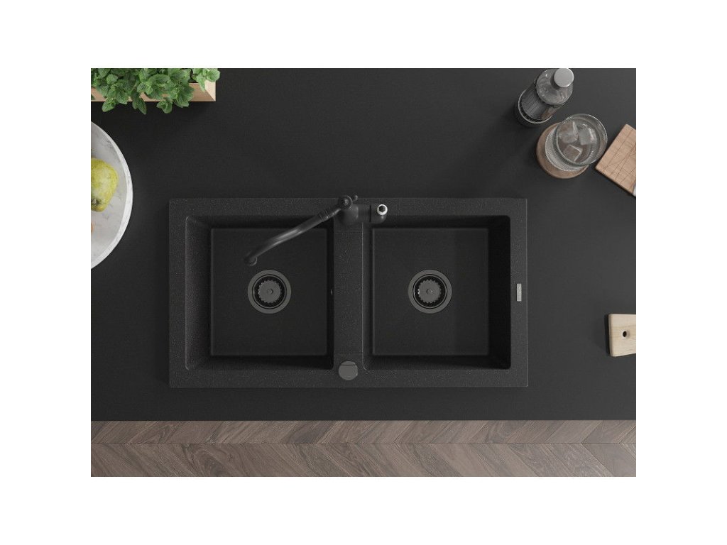 Granitový drez Mexen Mario s 2 misami a kuchynskou batériou Carla, čierna/strieborná metalíza - 6504-73-670700-70-B