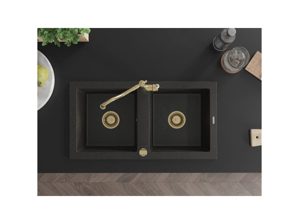 Granitový drez Mexen Mario s 2 misami a kuchynskou batériou Carla, čierna/zlatá metalíza - 6504-75-670700-50