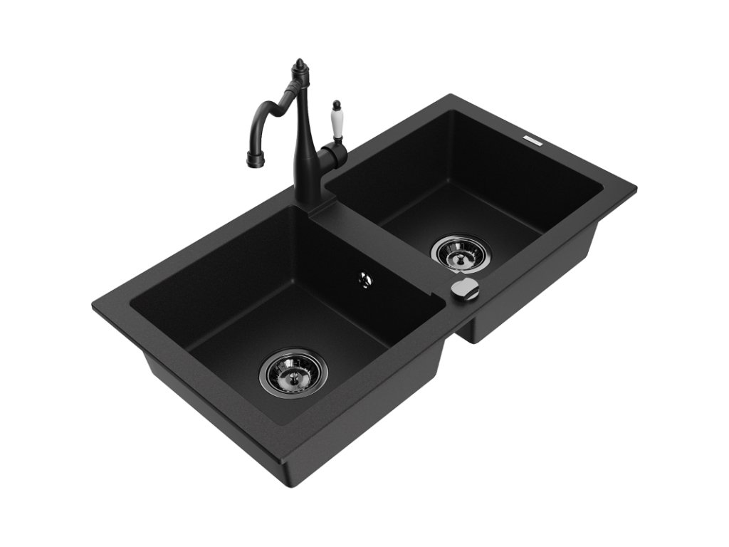 Granitový drez Mexen Mario s 2 misami a kuchynskou batériou Carla, čierny - 6504-77-670700-70-B