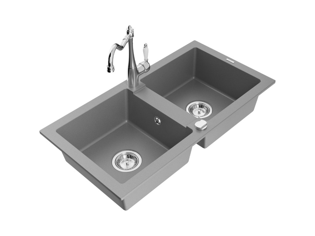Granitový drez Mexen Mario s 2 misami a kuchynskou batériou Carla, sivý - 6504-71-670700-00