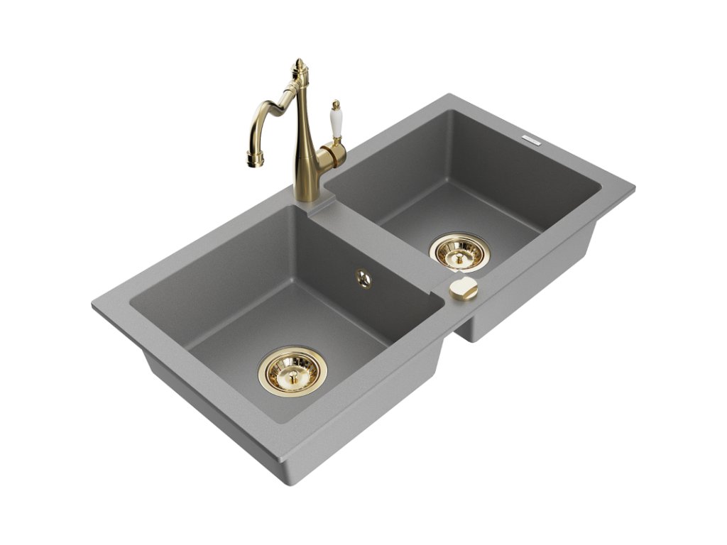 Granitový drez Mexen Mario s 2 misami a kuchynskou batériou Carla, sivý - 6504-71-670700-50