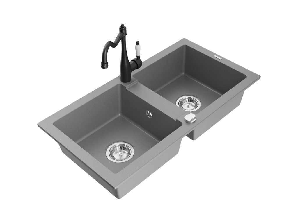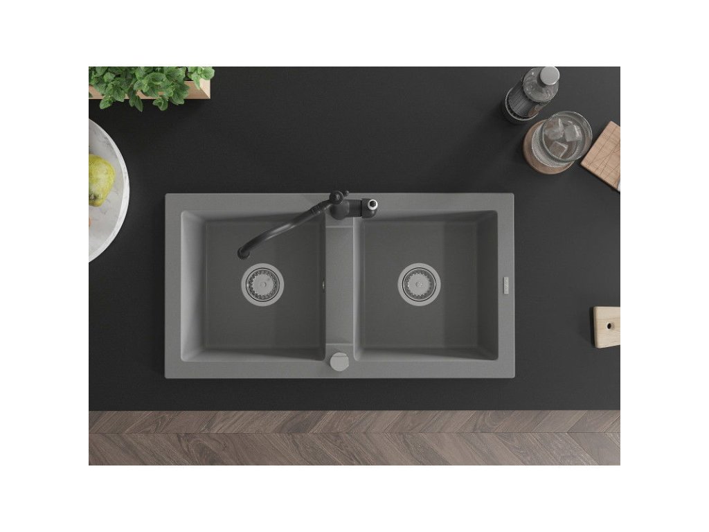 Granitový drez Mexen Mario s 2 misami a kuchynskou batériou Carla, sivý - 6504-71-670700-70