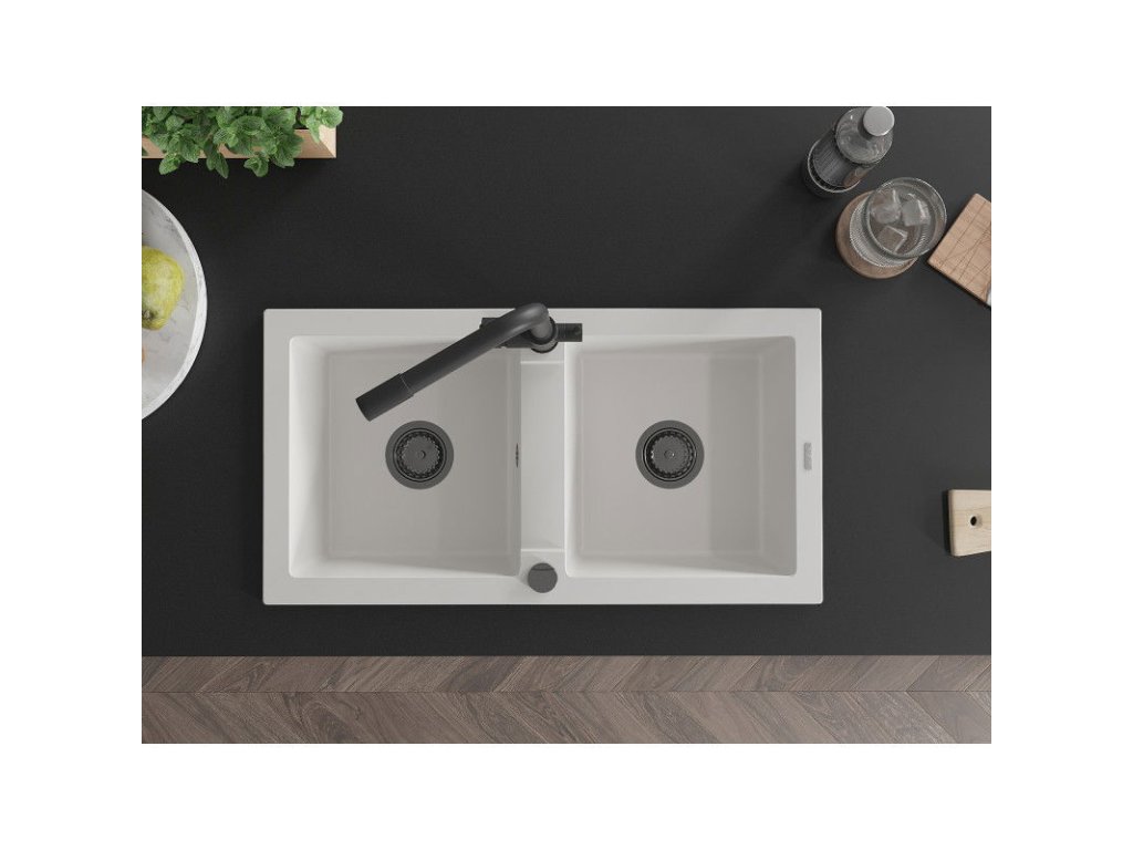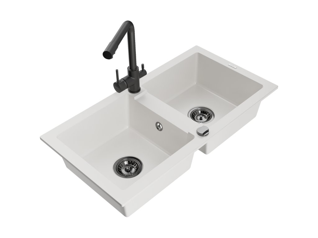 Granitový drez Mexen Mario s 2 misami a kuchynskou batériou Duero, biely - 6504-20-671600-70