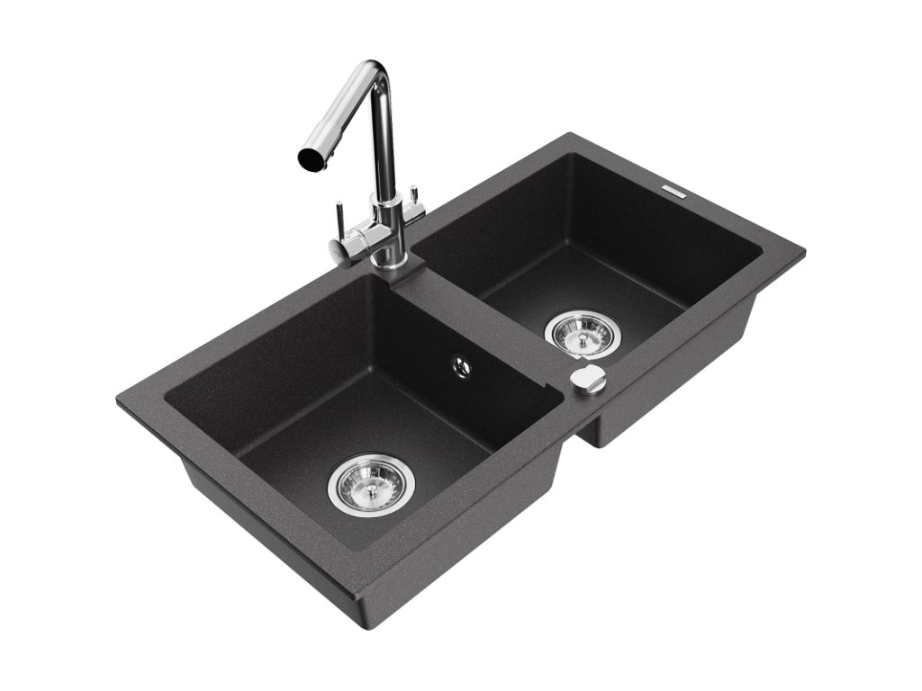Granitový drez Mexen Mario s 2 misami a kuchynskou batériou Duero, čierna škvrnitá - 6504-76-671600-00