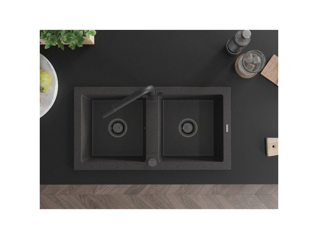 Granitový drez Mexen Mario s 2 misami a kuchynskou batériou Duero, čierna škvrnitá - 6504-76-671600-70-B