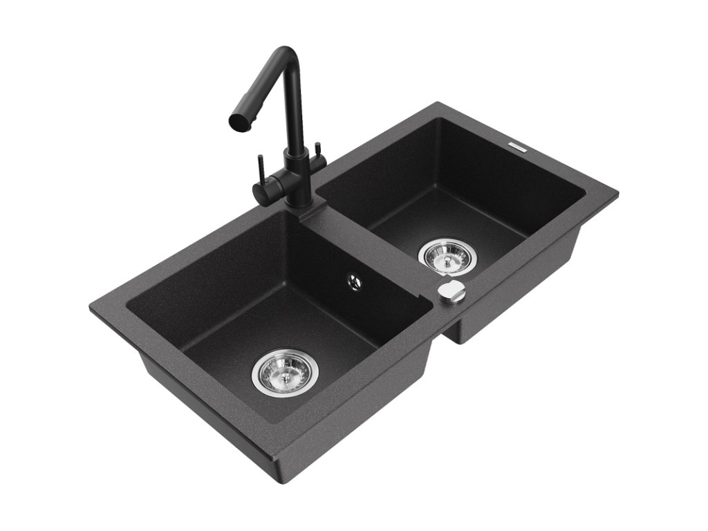 Granitový drez Mexen Mario s 2 misami a kuchynskou batériou Duero, čierna škvrnitá - 6504-76-671600-70
