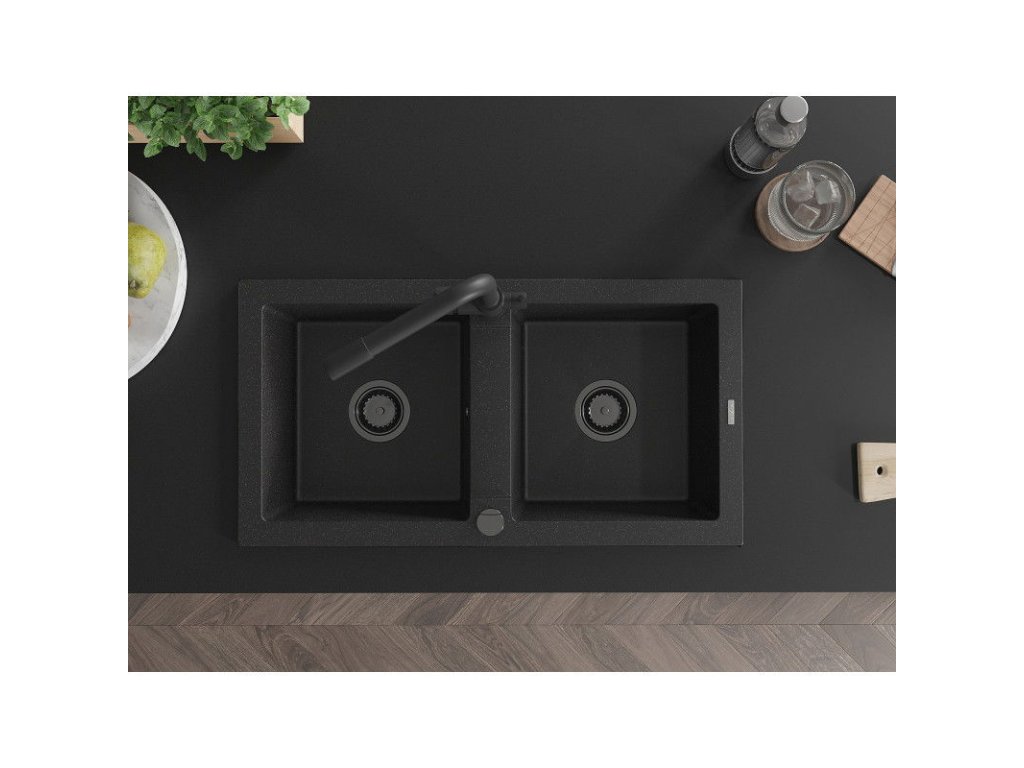 Granitový drez Mexen Mario s 2 misami a kuchynskou batériou Duero, čierna/strieborná metalíza - 6504-73-671600-70-B