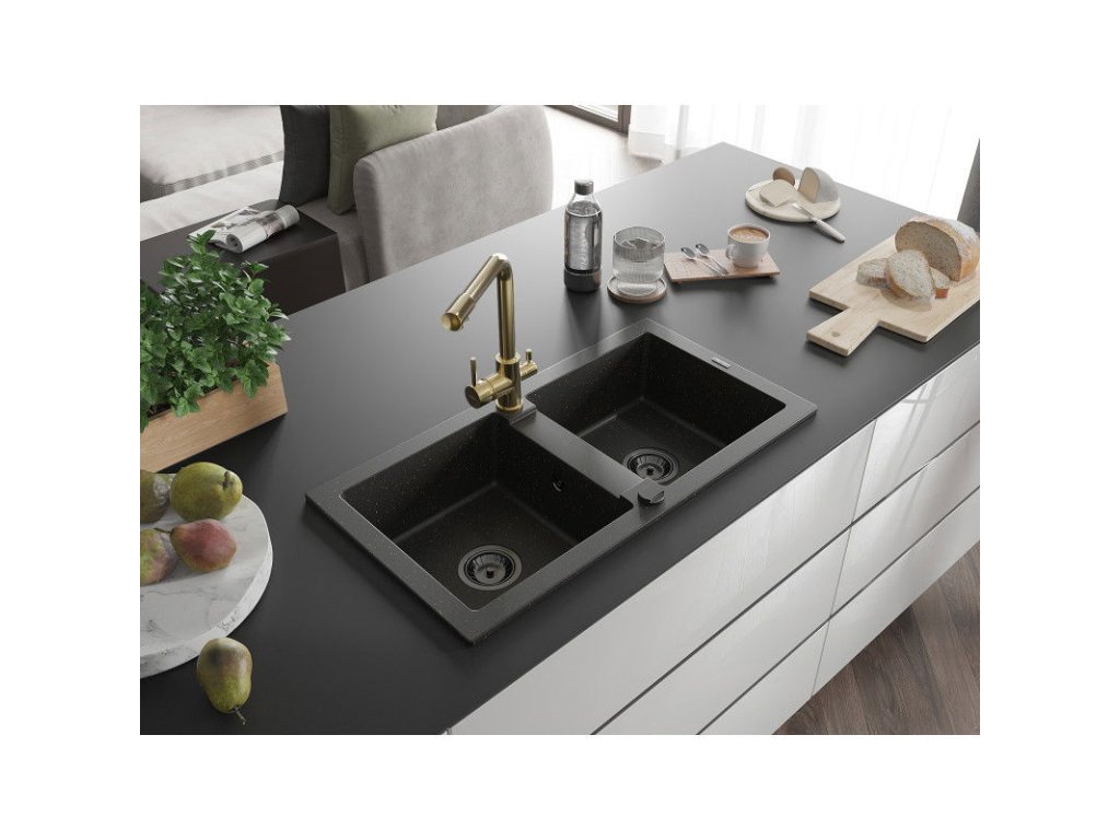 Granitový drez Mexen Mario s 2 misami a kuchynskou batériou Duero, čierna/zlatá metalíza - 6504-75-671600-50-B