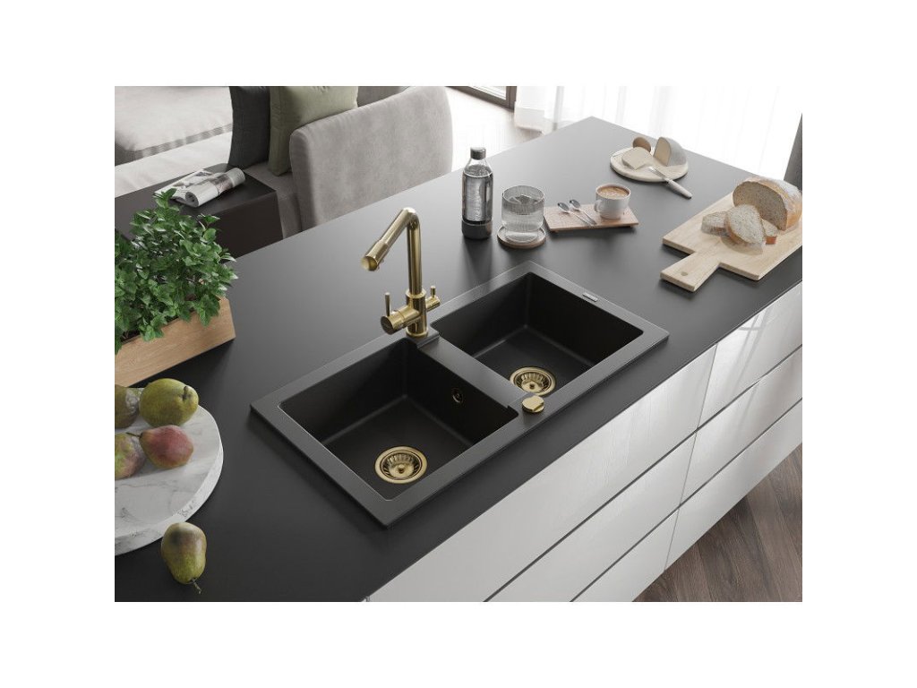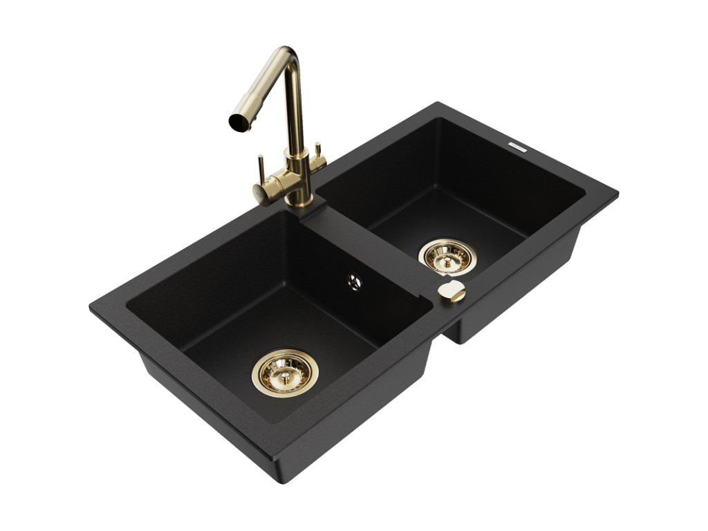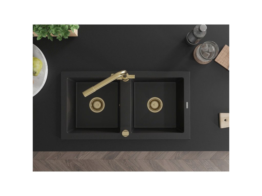 Granitový drez Mexen Mario s 2 misami a kuchynskou batériou Duero, čierny - 6504-77-671600-50