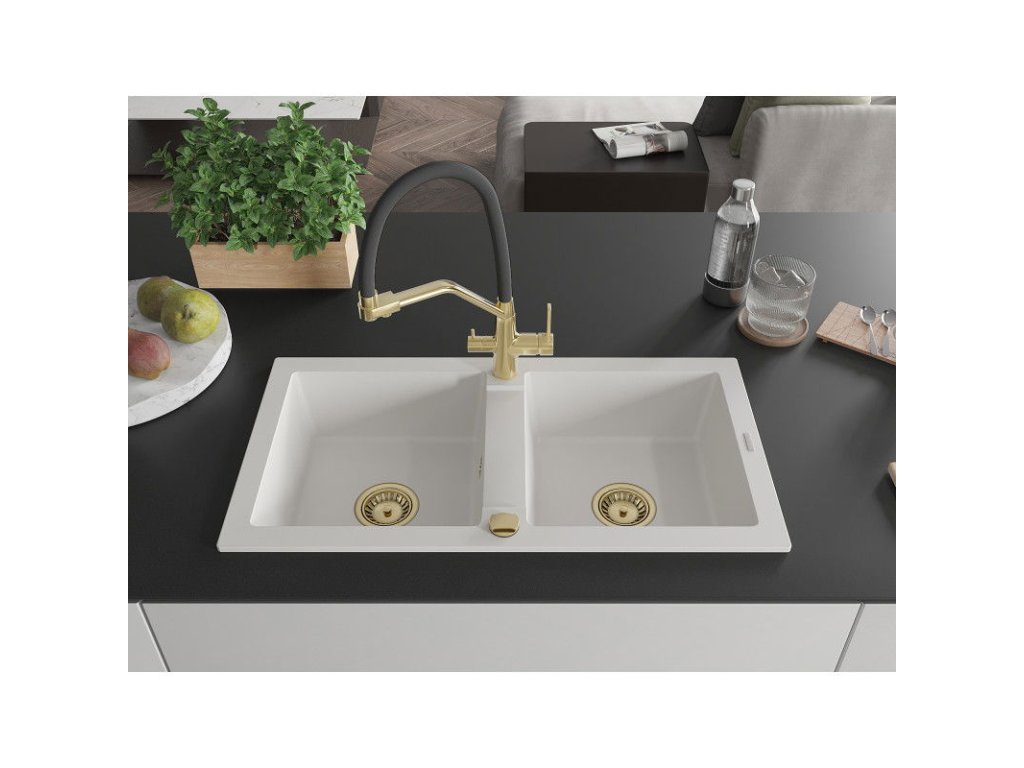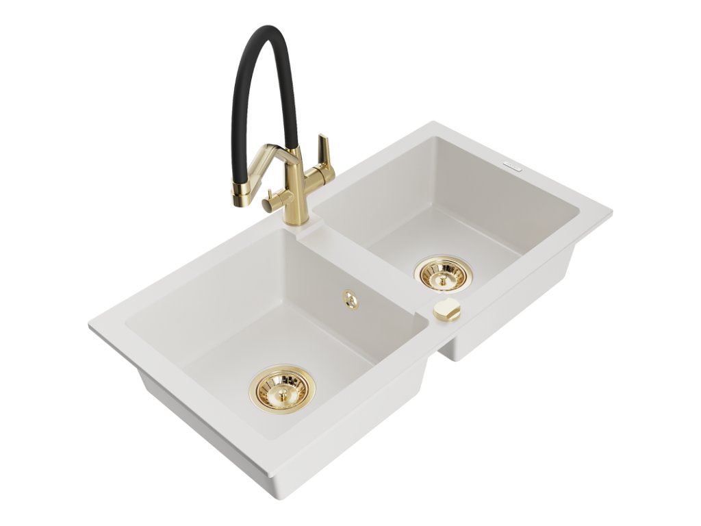 Granitový drez Mexen Mario s 2 misami a kuchynskou batériou Duo, biely - 6504-20-671701-57-G