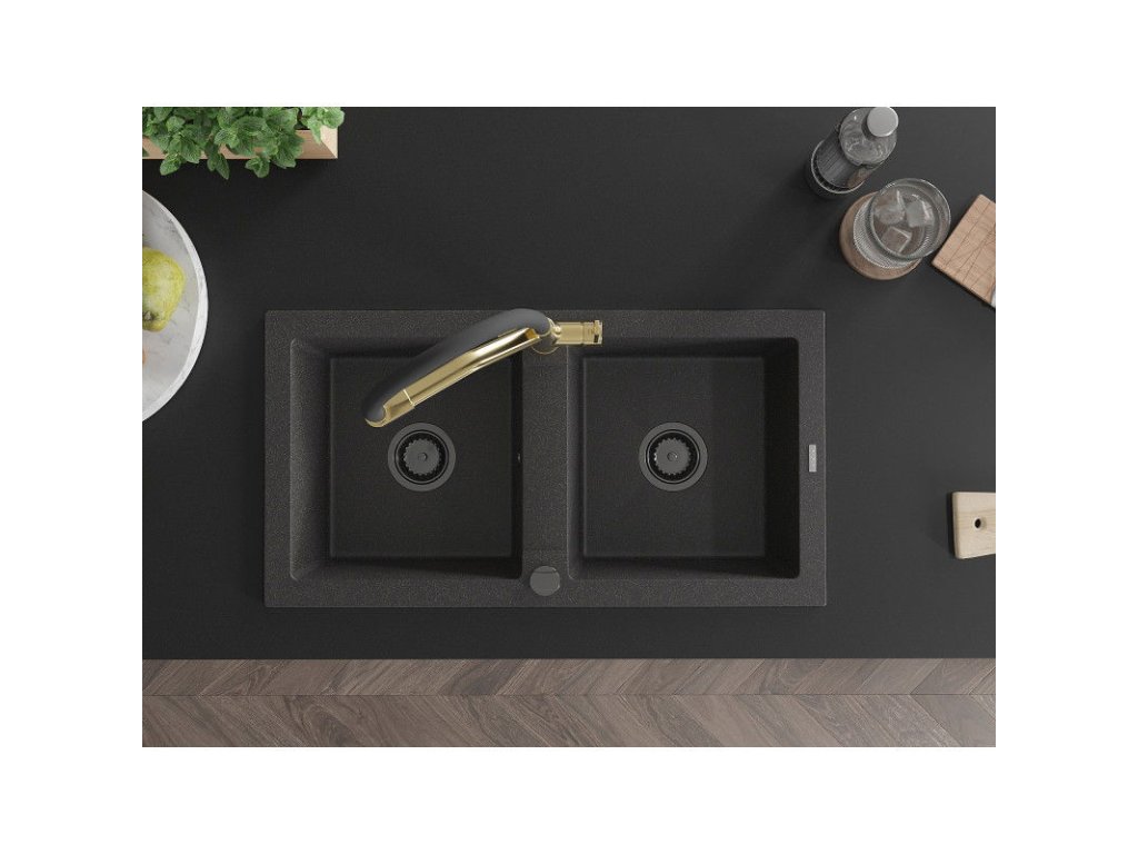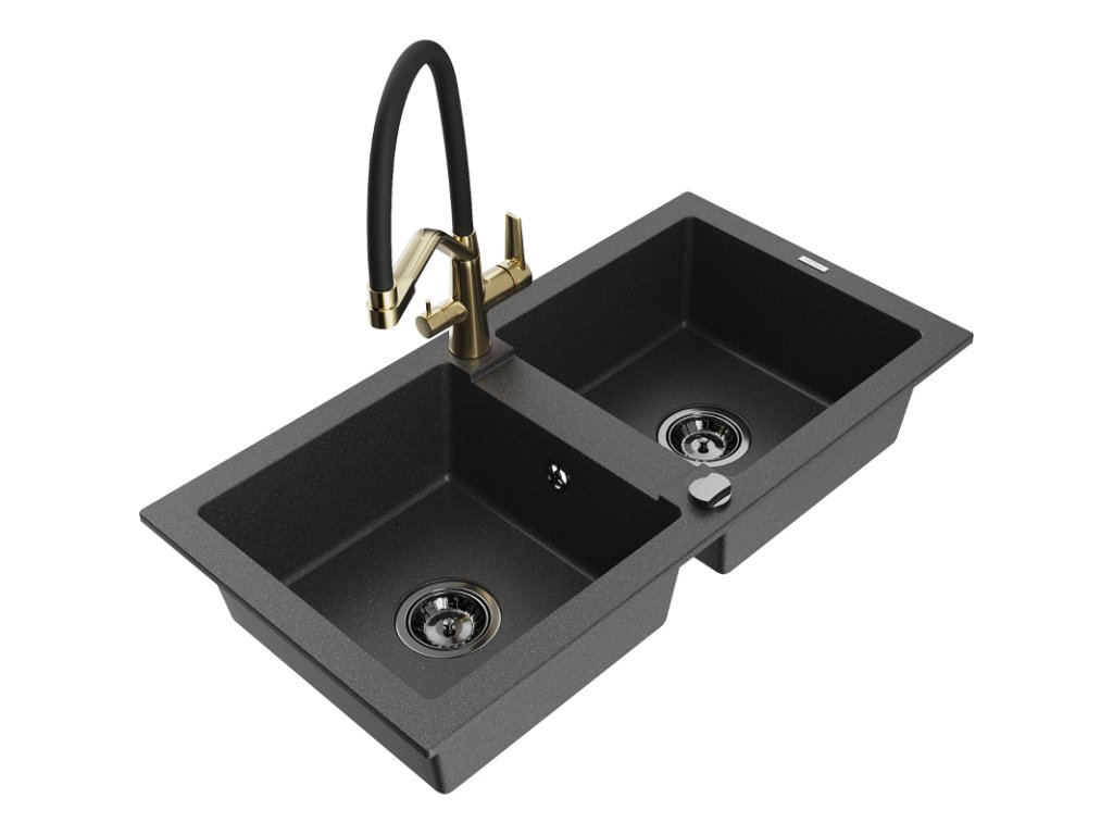 Granitový drez Mexen Mario s 2 misami a kuchynskou batériou Duo, čierna škvrnitá - 6504-76-671701-57-B