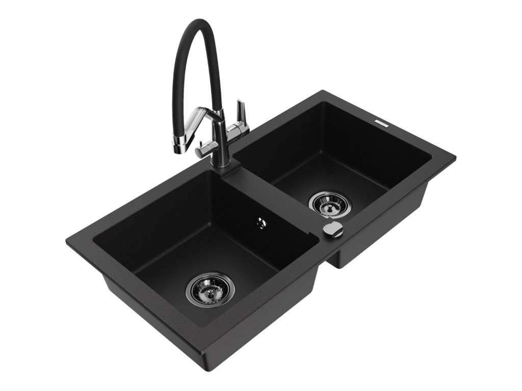 Granitový drez Mexen Mario s 2 misami a kuchynskou batériou Duo, čierny - 6504-77-671701-07-B