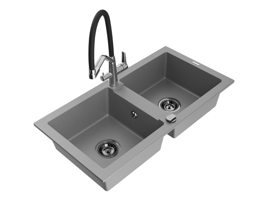 Granitový drez Mexen Mario s 2 misami a kuchynskou batériou Duo, sivý - 6504-71-671701-07-B