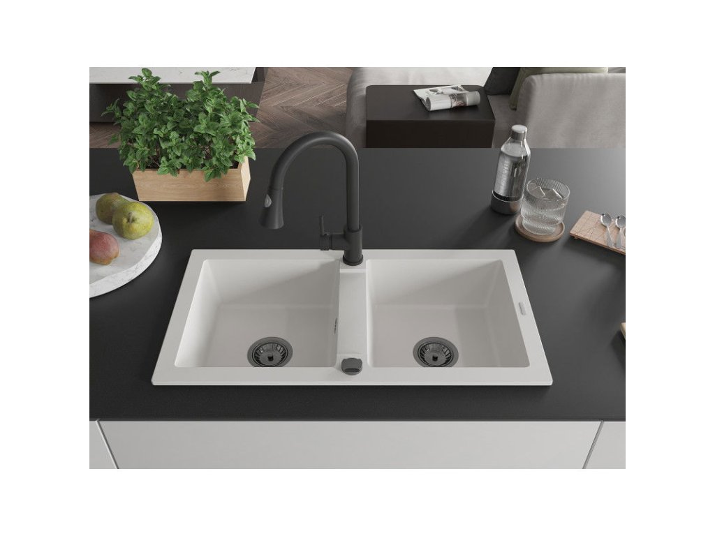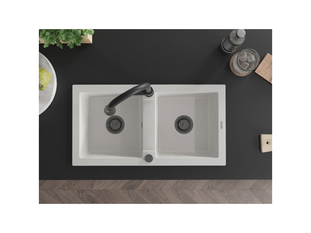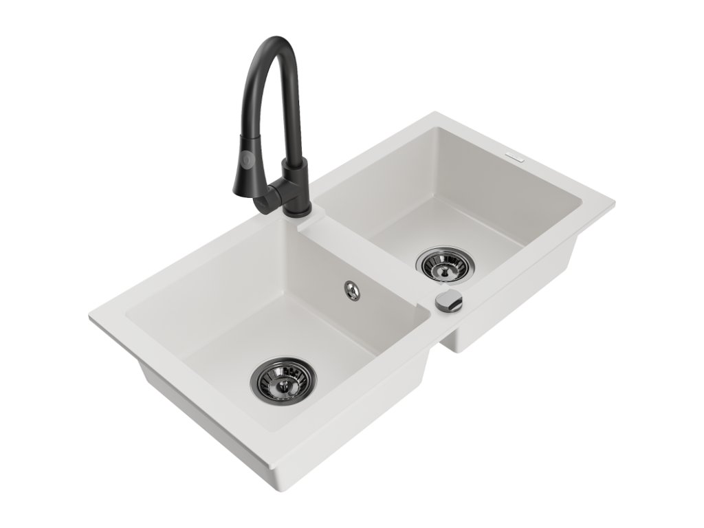 Granitový drez Mexen Mario s 2 misami a kuchynskou batériou Elia, biely - 6504-20-670101-70