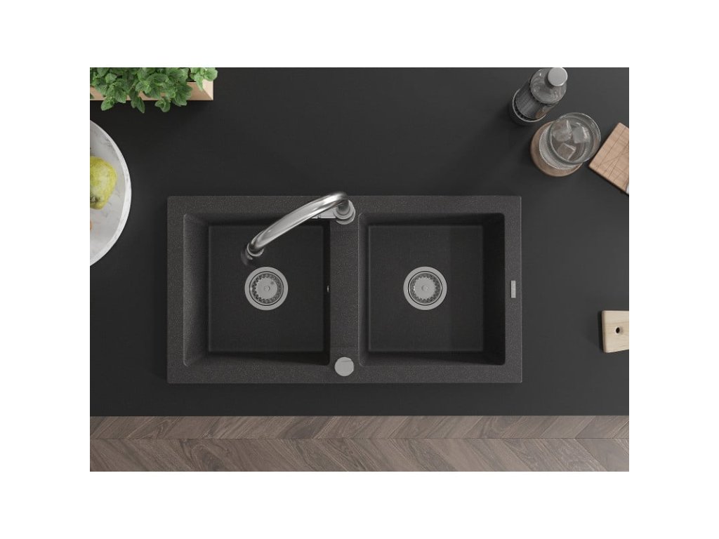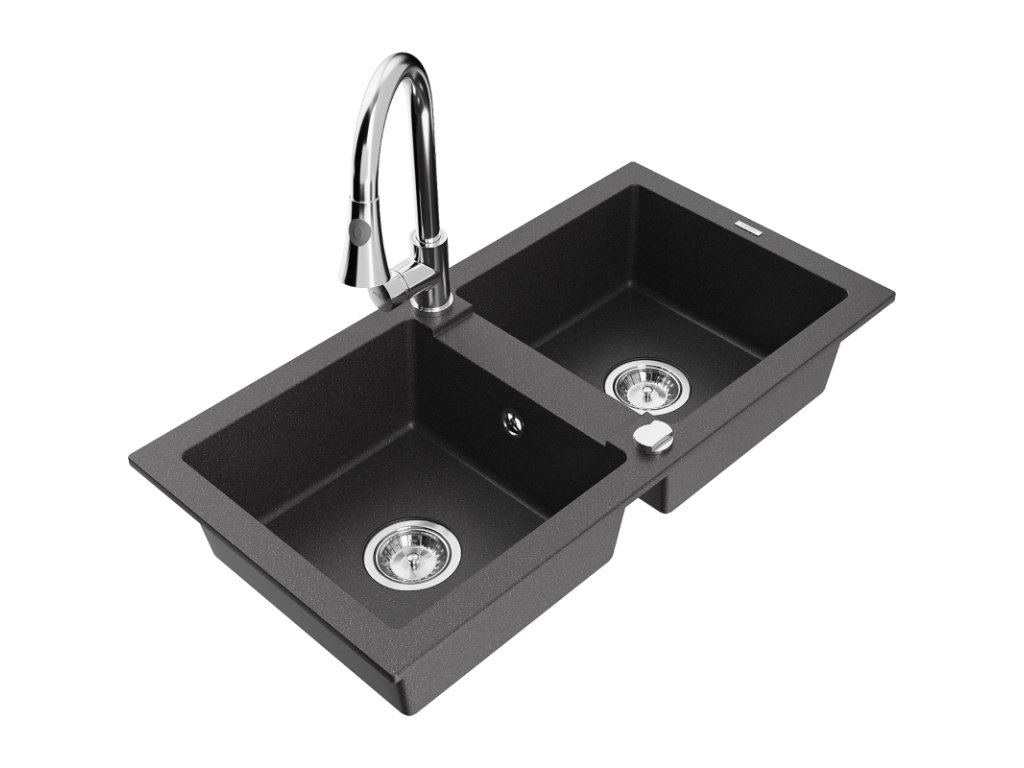 Granitový drez Mexen Mario s 2 misami a kuchynskou batériou Elia, čierna škvrnitá - 6504-76-670101-00