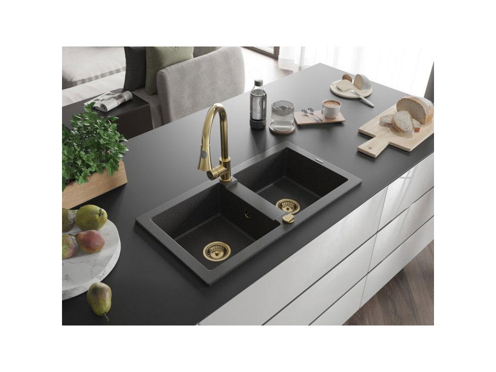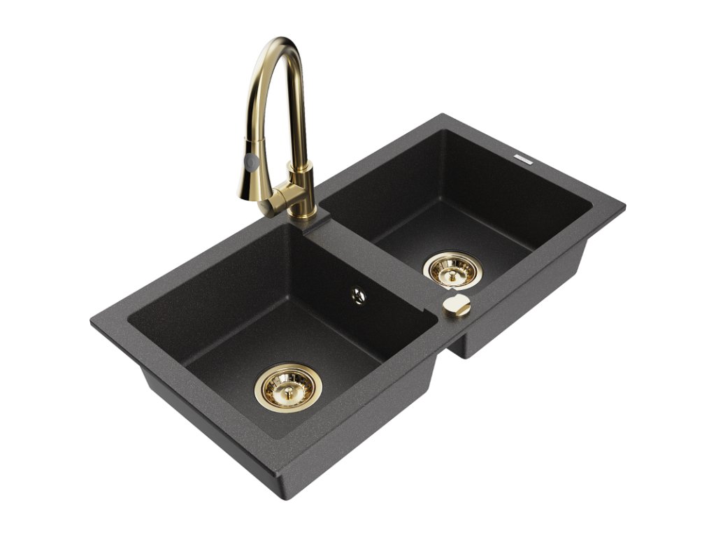 Granitový drez Mexen Mario s 2 misami a kuchynskou batériou Elia, čierna škvrnitá - 6504-76-670101-50