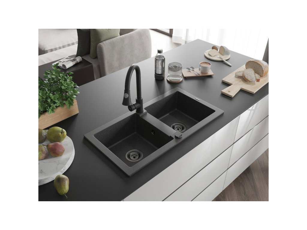 Granitový drez Mexen Mario s 2 misami a kuchynskou batériou Elia, čierna škvrnitá - 6504-76-670101-70-B