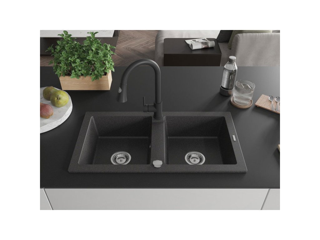 Granitový drez Mexen Mario s 2 misami a kuchynskou batériou Elia, čierna škvrnitá - 6504-76-670101-70