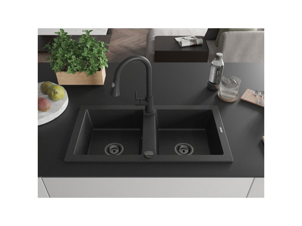 Granitový drez Mexen Mario s 2 misami a kuchynskou batériou Elia, čierna/strieborná metalíza - 6504-73-670101-70-B