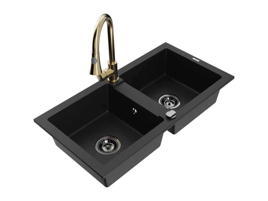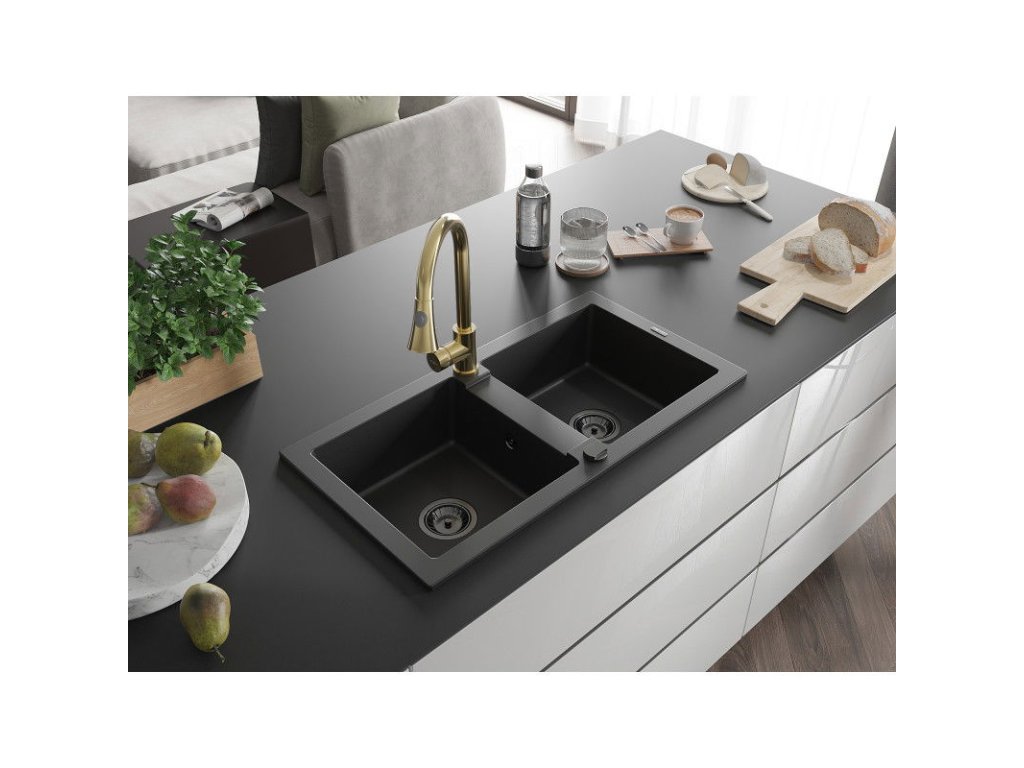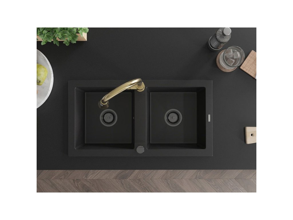 Granitový drez Mexen Mario s 2 misami a kuchynskou batériou Elia, čierny - 6504-77-670101-50-B