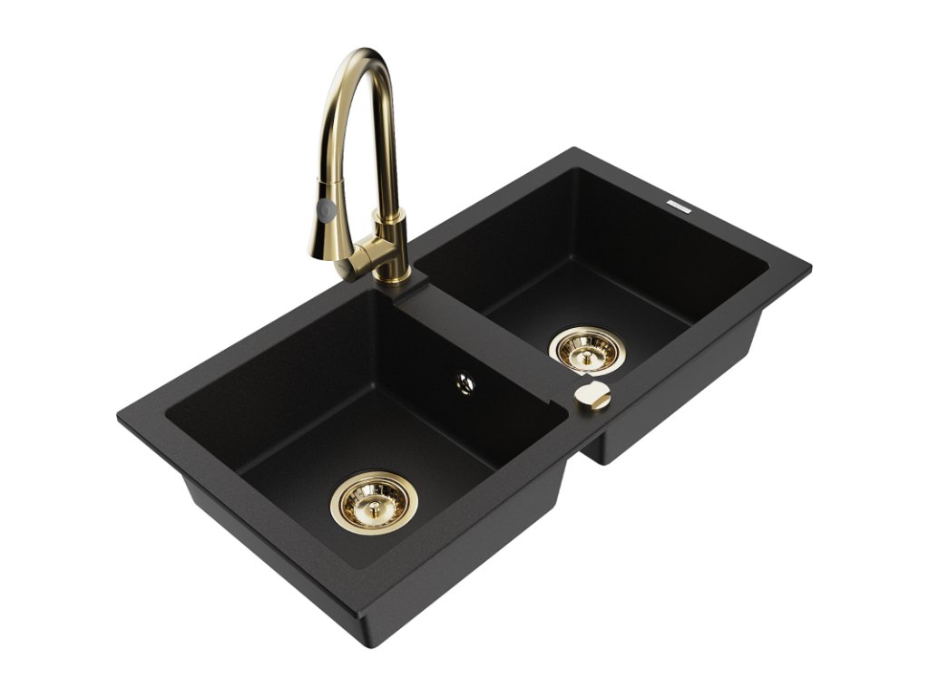 Granitový drez Mexen Mario s 2 misami a kuchynskou batériou Elia, čierny - 6504-77-670101-50