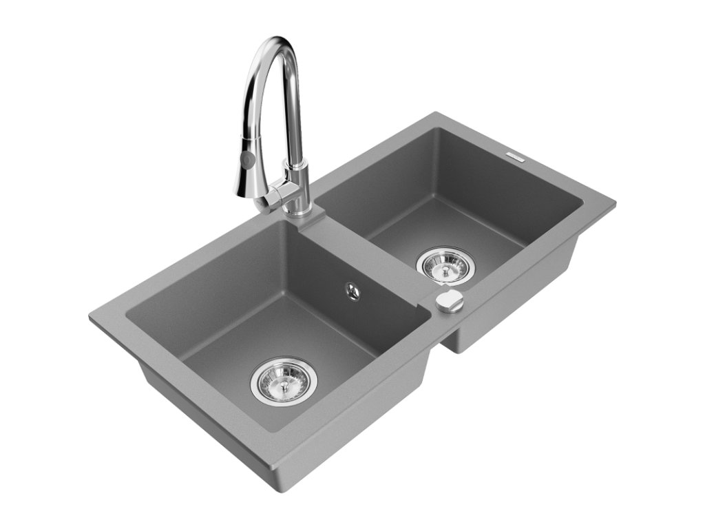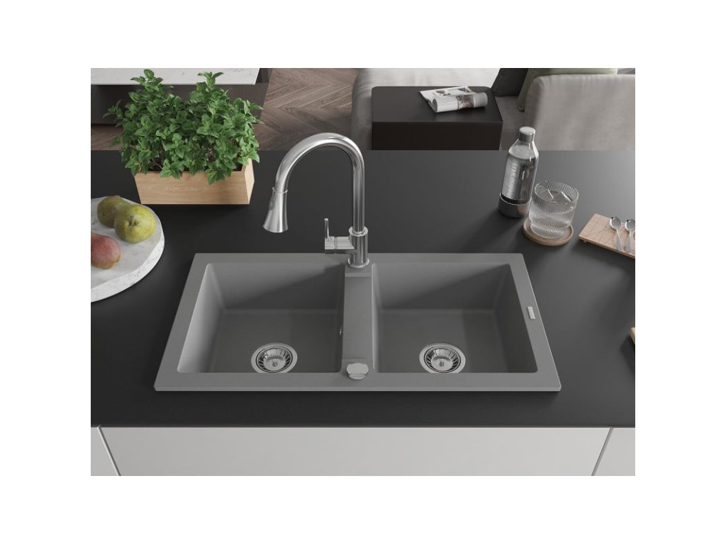 Granitový drez Mexen Mario s 2 misami a kuchynskou batériou Elia, sivý - 6504-71-670101-00