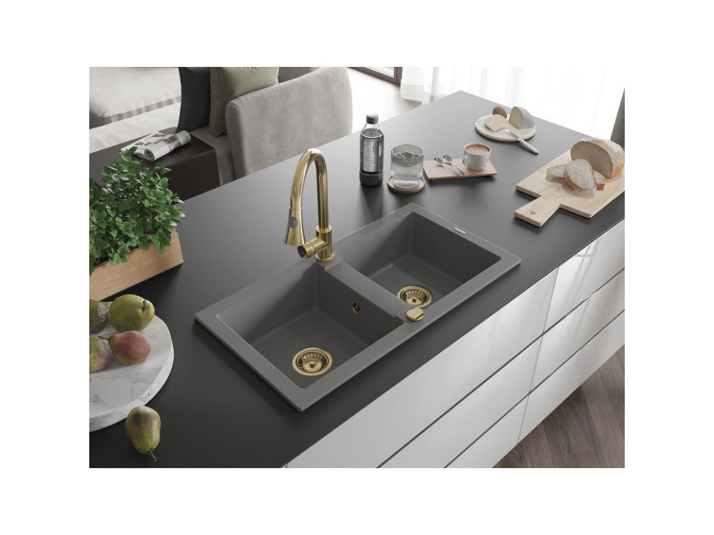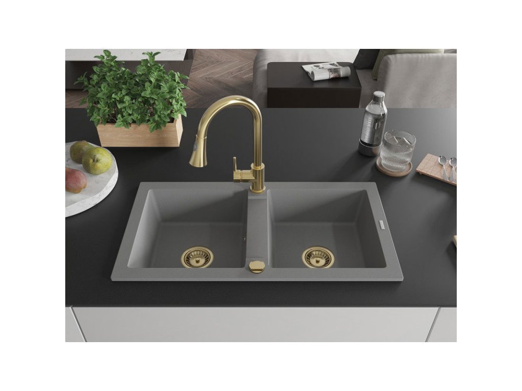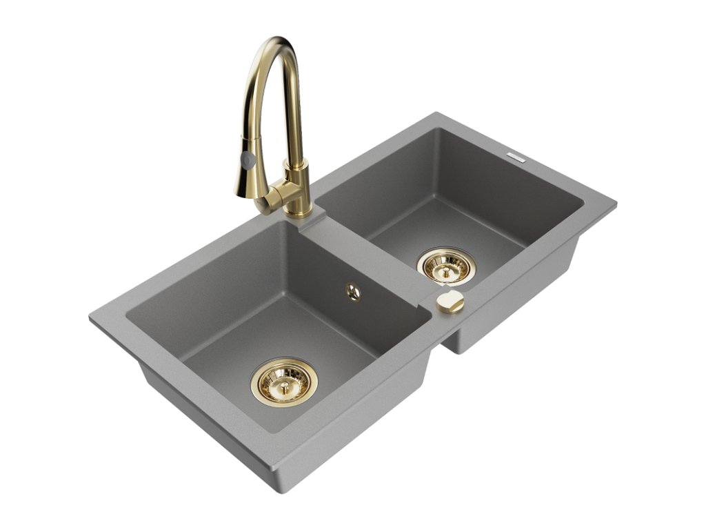 Granitový drez Mexen Mario s 2 misami a kuchynskou batériou Elia, sivý - 6504-71-670101-50