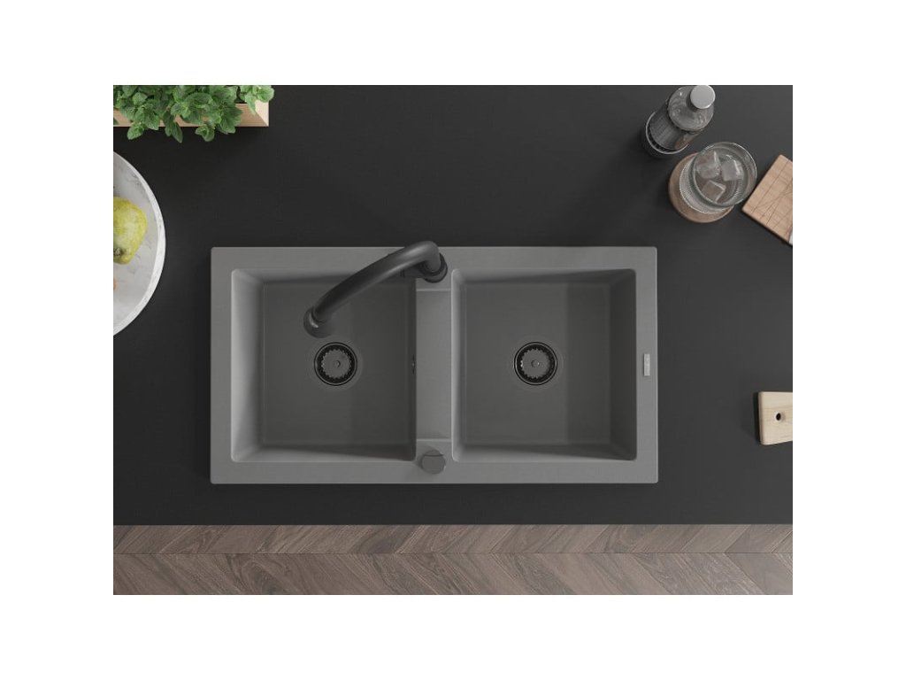 Granitový drez Mexen Mario s 2 misami a kuchynskou batériou Elia, sivý - 6504-71-670101-70-B